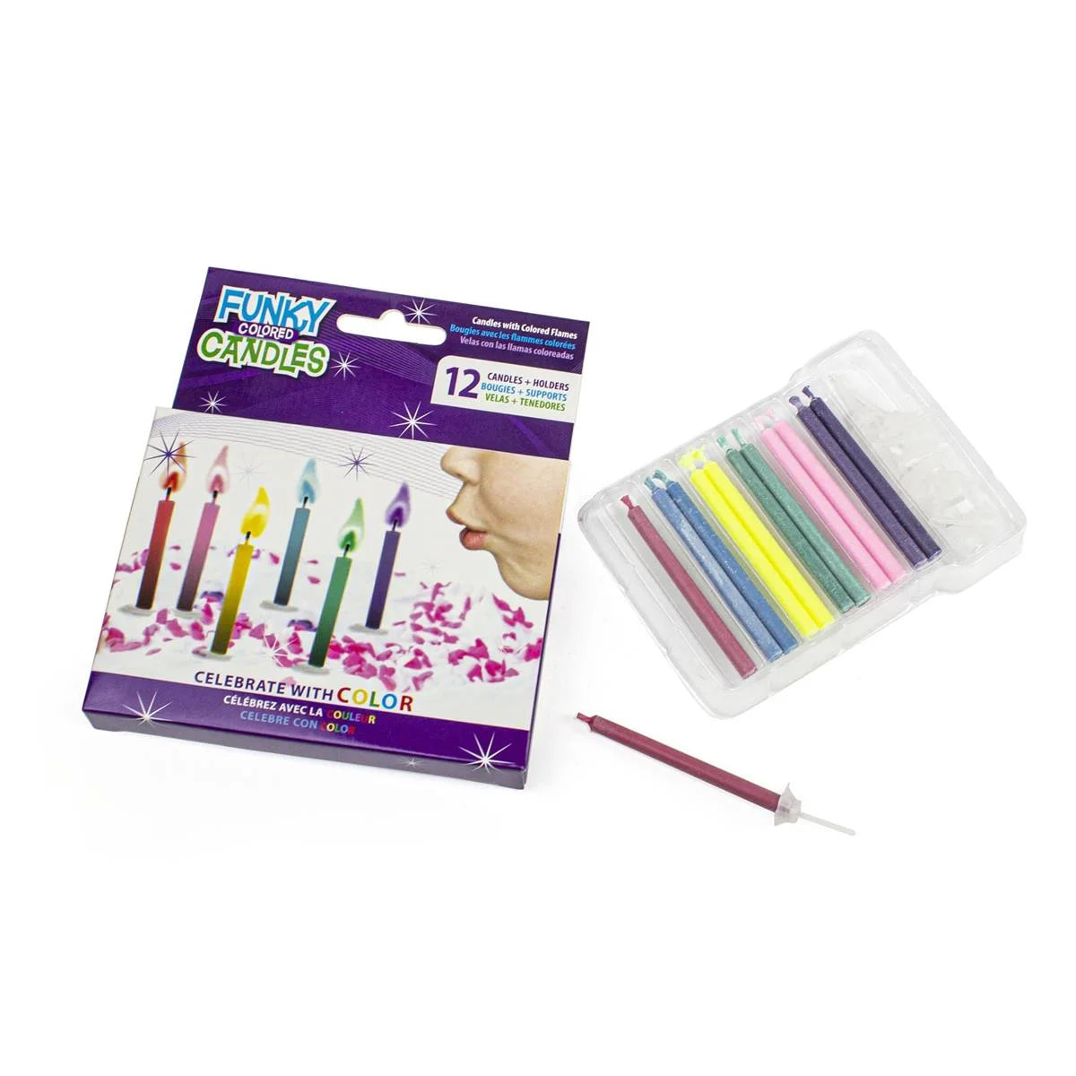 | Name | 12-pcs Funky Colored Flame Candles w Holders, color box |