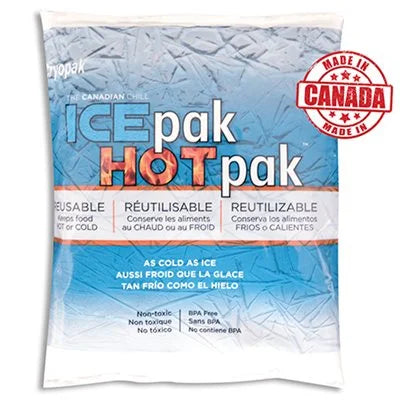 Made in Canada.For use in insulated bags and coolers.Keeps food cold or hot. Lasts longer than ice.Non toxic; reusable; environmentally safe.24 packs per tray.Size: 17.8 x 16 cm (7" x 6.25")